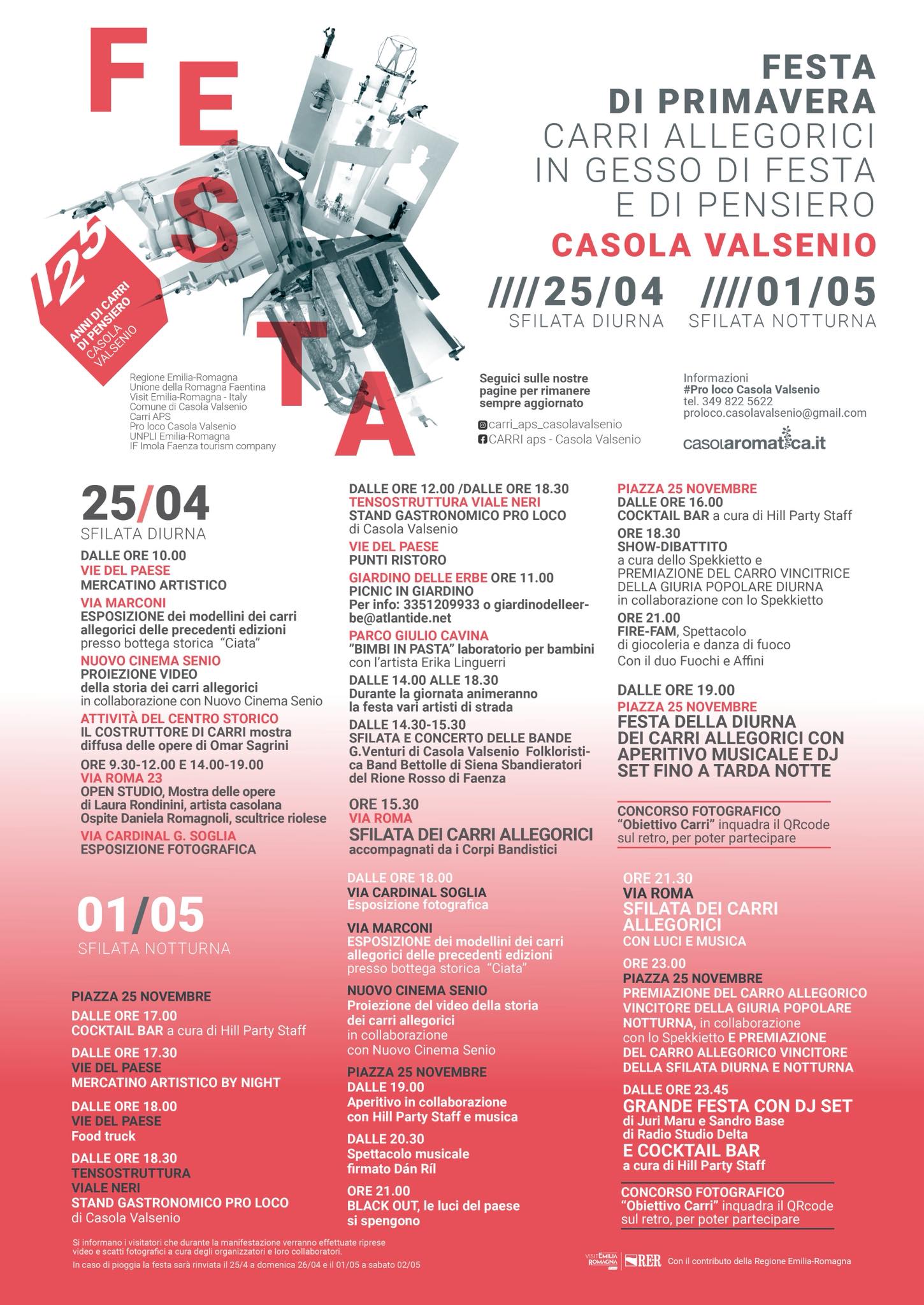 Ogni anno, si svolge a Càsola Valsenio la Festa di Primavera che ha come punto focale la sfilata di tre carri allegorici in diurna il 25 APRILE e in notturna il PRIMO MAGGIO. Si tratta di carri “seri”, di festa e di pensiero, unici per i temi trattati, così da fare della festa casolana l’unico Carnevale serio che si conosca.